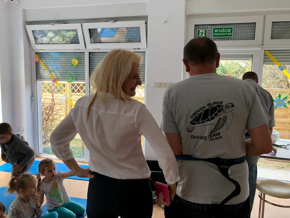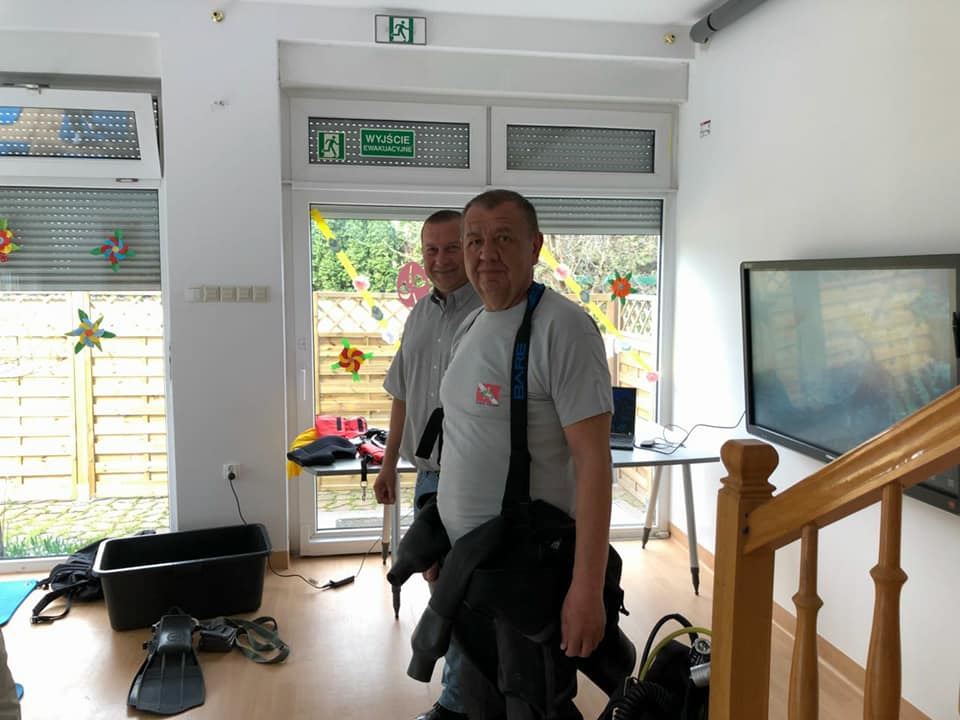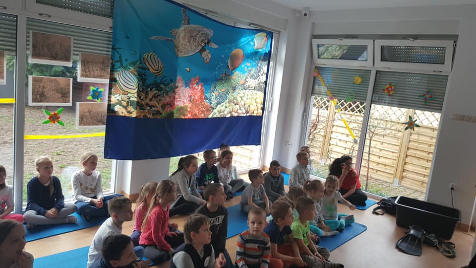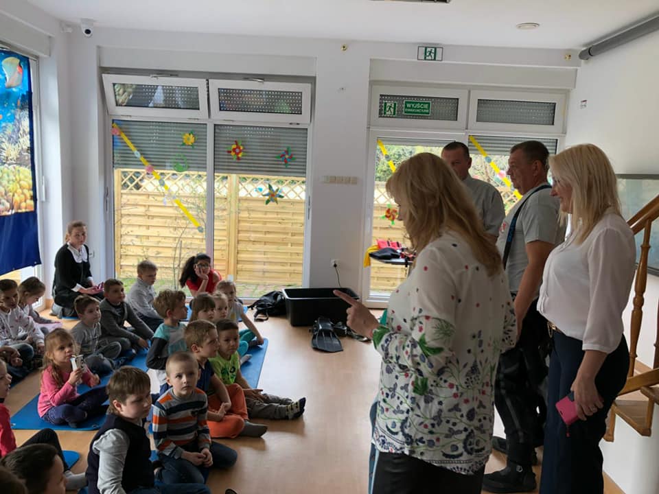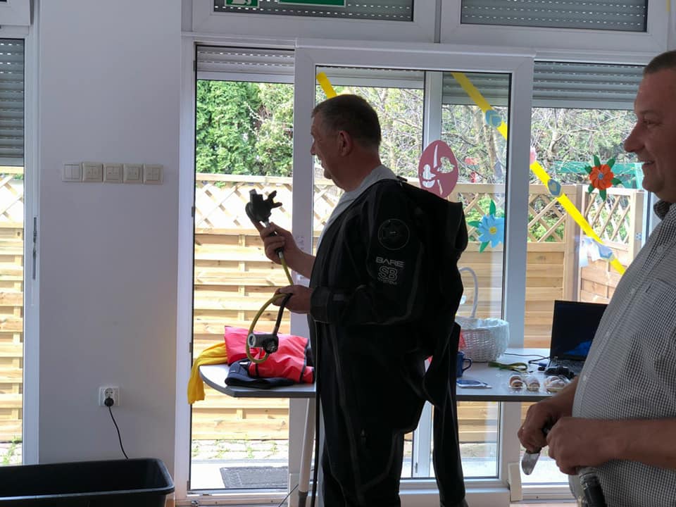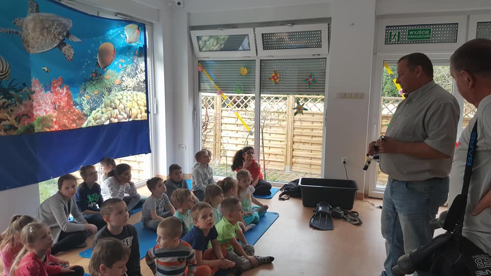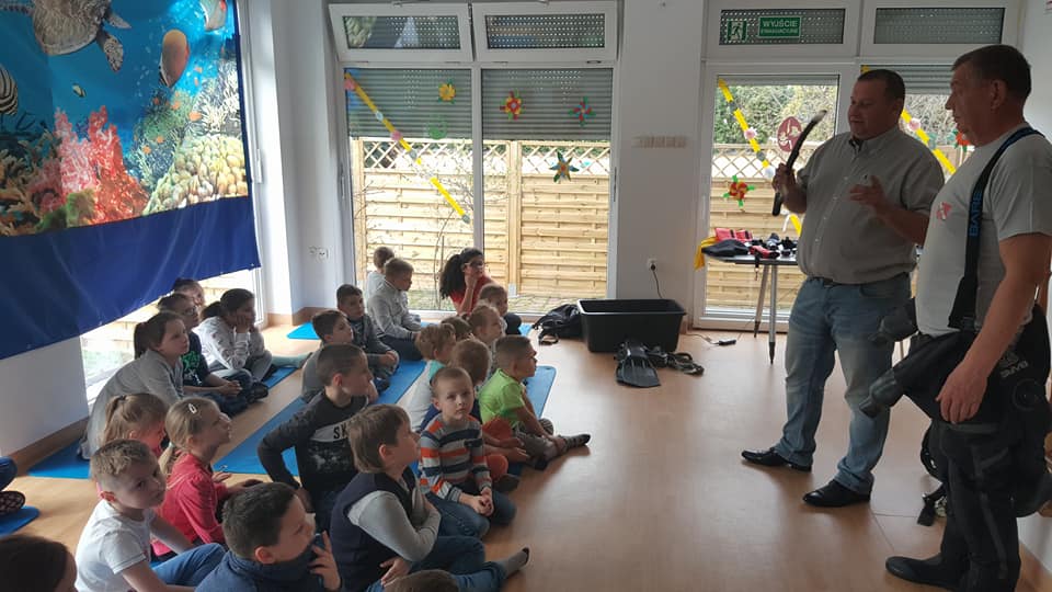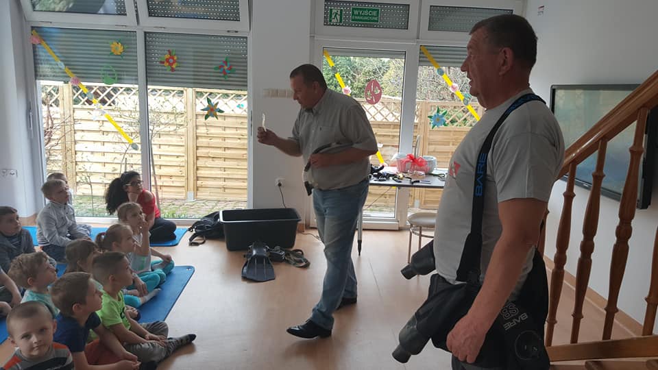 Koledzy mówili o bezpieczeństwie nad wodą, ekologii a w tym zostawiania porządku po sobie i nie zaśmiecania terenów nad wodą, opowiadali o stworzeniach jakie spotykamy pod wodą oraz pokazali sprzęt nurkowy.